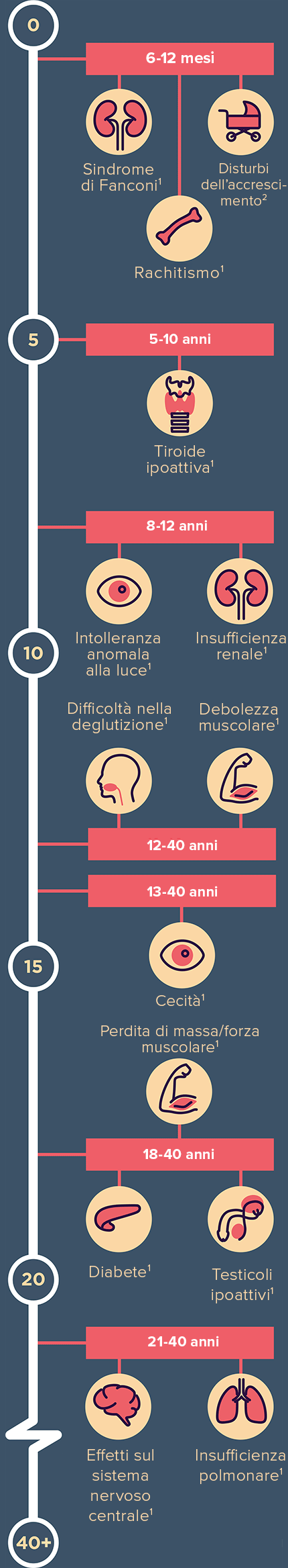 Tempistiche di comparsa dei sintomi di cistinosi nei pazienti che non ricevono un’adeguata terapia